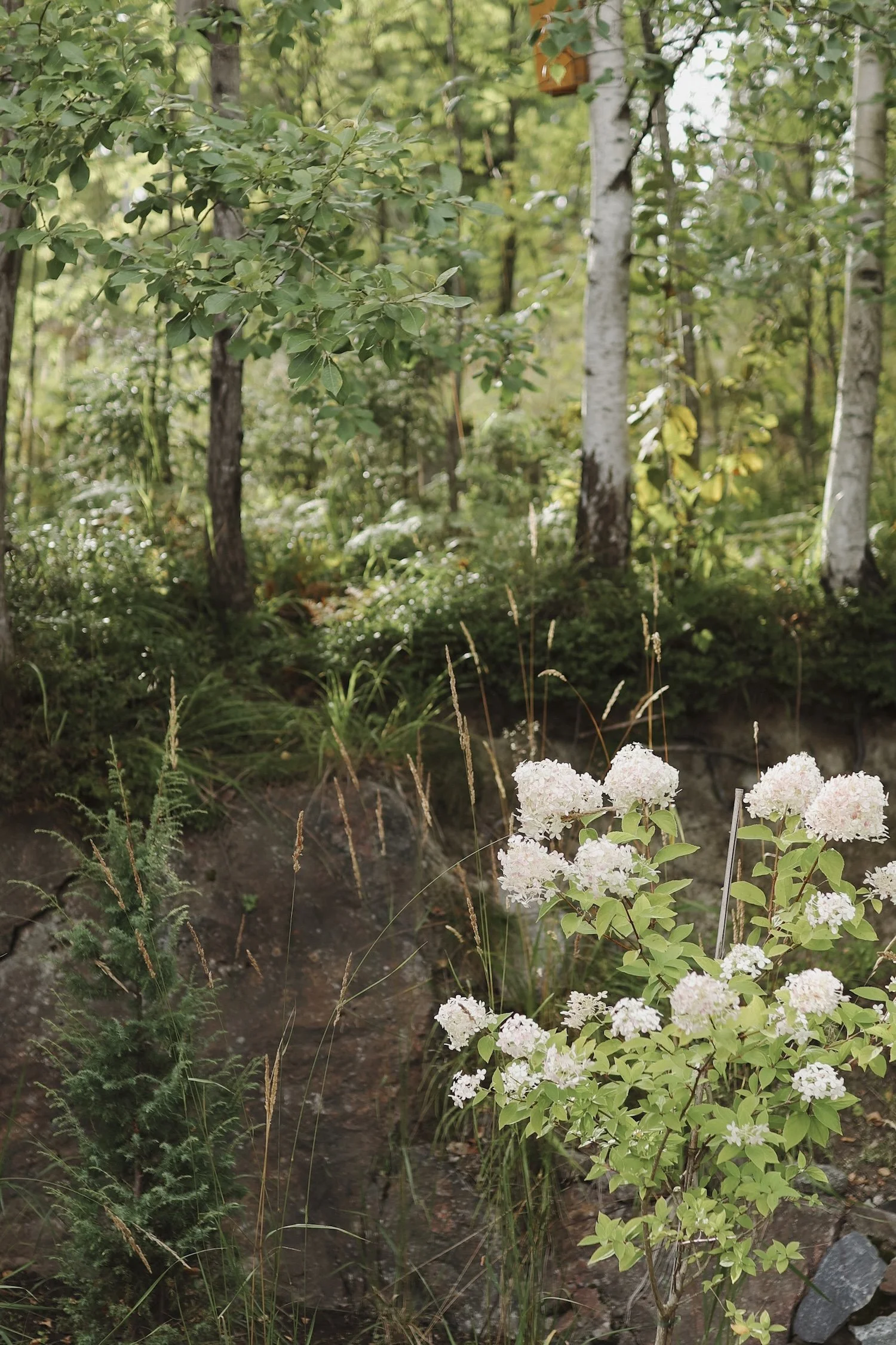 Takapihalle rakennettiin liuskemuurikivillä korotettu istutusalue, johon istutettiin katajia, hortensioita ja korkeita heiniä. Tämä näkymä avautuu suoraan perheen ikkunoista ja tuo pihaan pehmeyttä ja väriä.