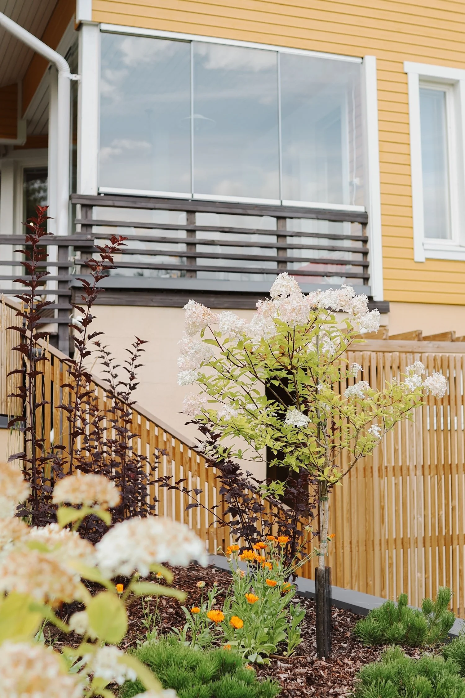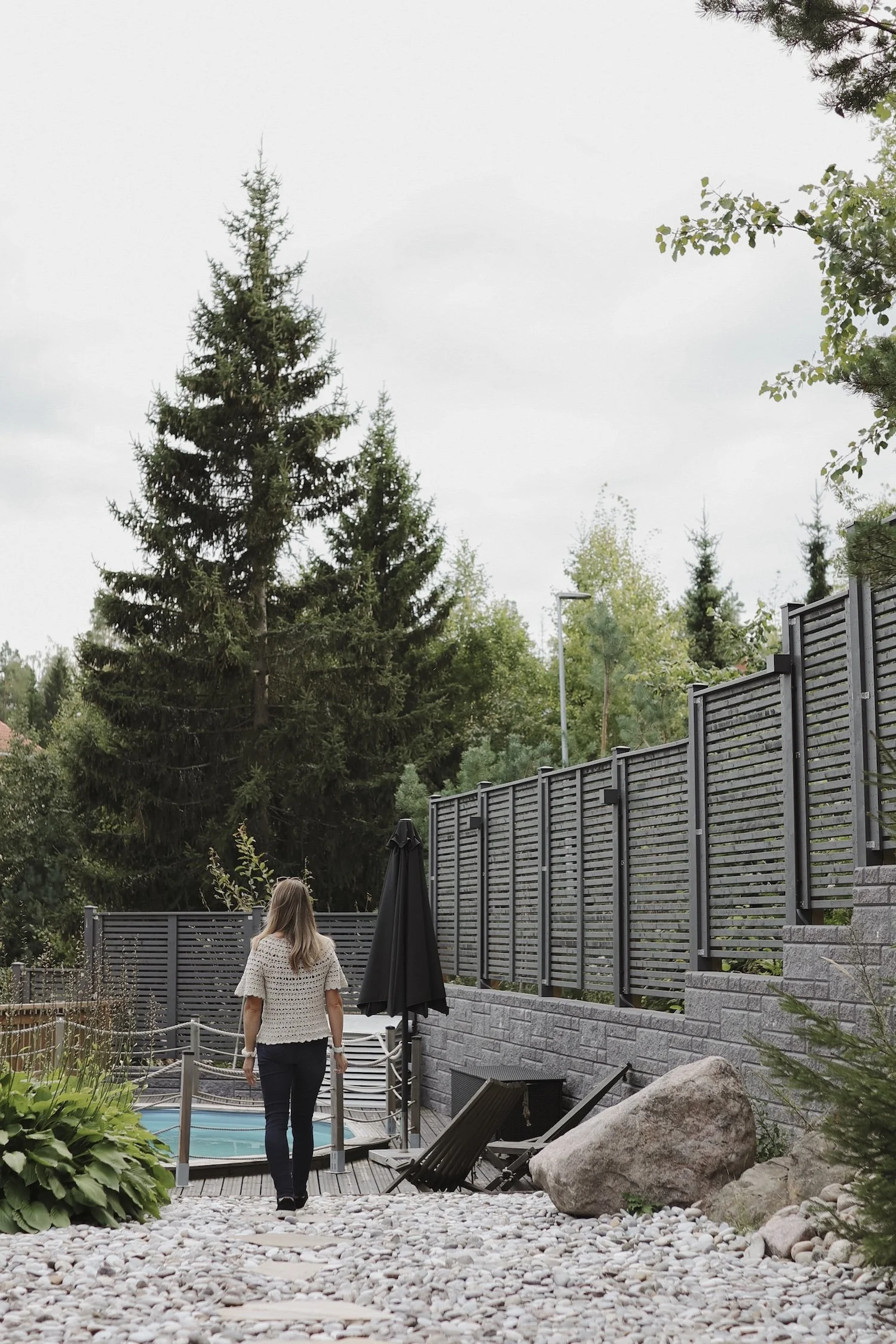 Kadun puolelle rakennettiin tukimuurin päälle 140 cm korkea puuaita Kruunuaita-aitaelementeistä, mikä toi tervetullutta yksityisyyttä ja suojaisuuden tunnetta saman tien.