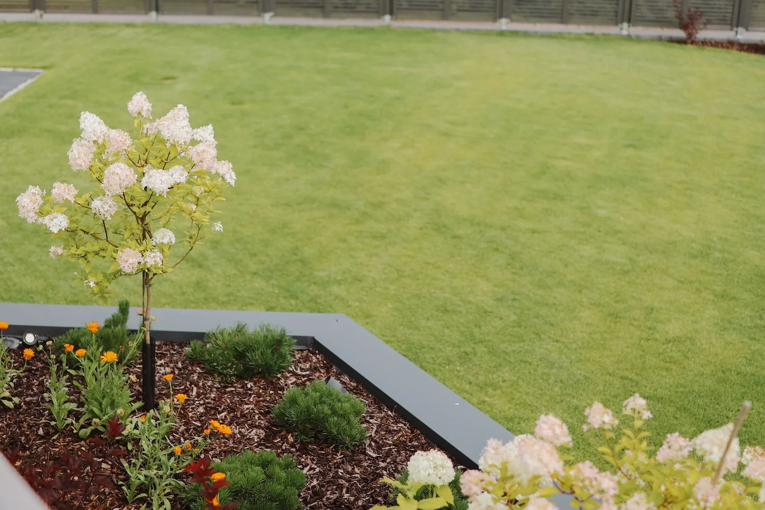 Painunut ja huonosti kasvanut nurmikko uusittiin siirtonurmella, ja sen yhteyteen rakennettiin Gardenan automaattinen kastelujärjestelmä. Sprinklerit suunniteltiin siten, etteivät ne kastele ohikulkijoita tai talon seinustoja. Robottiruohonleikkuri pitää nurmikon tasaisena.