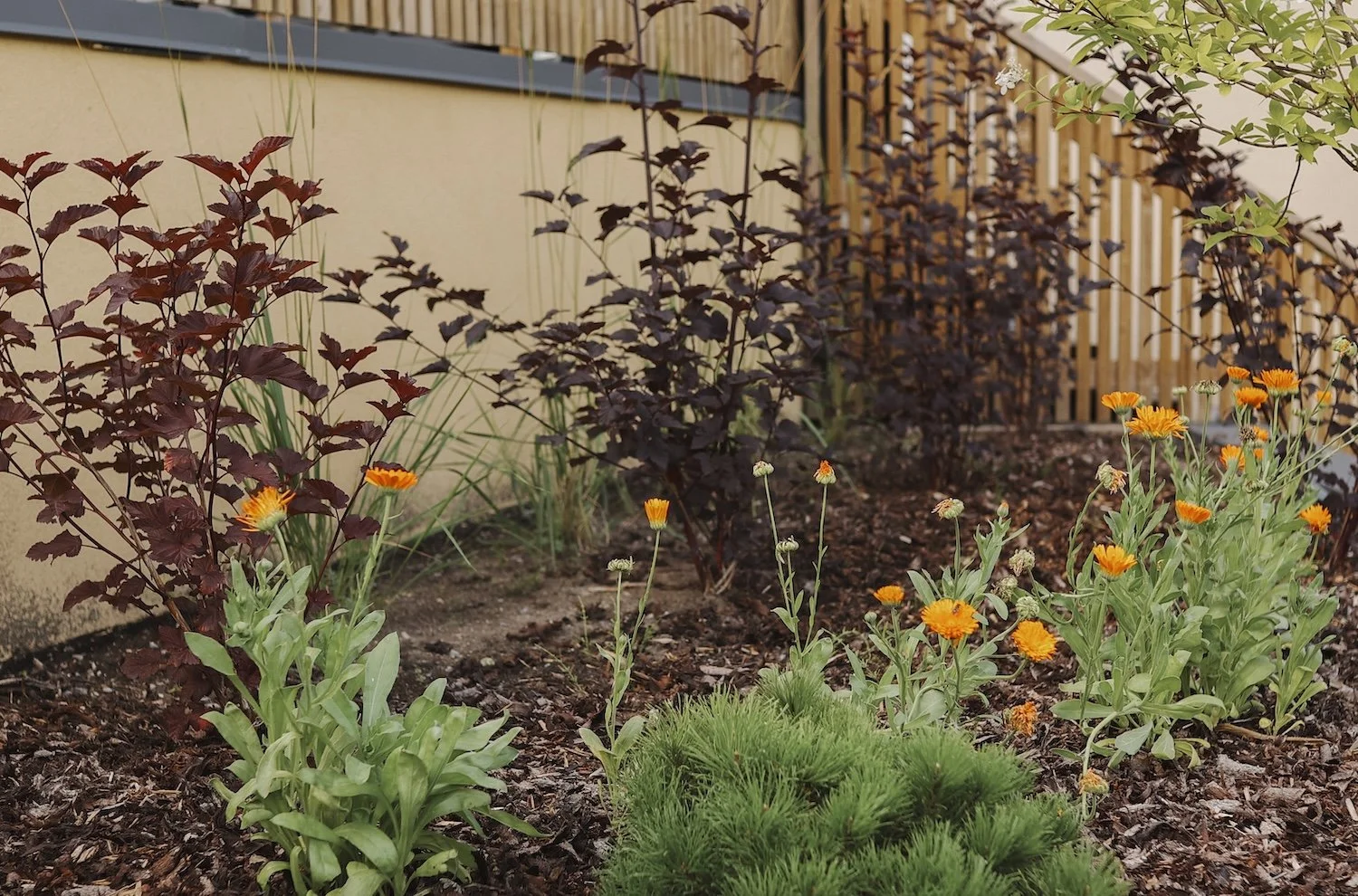 Kasvillisuudessa luotettiin helppohoitoisiin ja näyttäviin lajeihin: pilarikatajiin, tuivioihin, kääpiövuorimäntyihin, purppuraheisiangervoihin, koivuangervoihin sekä hortensioihin, jotka kestävät hyvin vaihtelevia olosuhteita ja pitävät pihan ilmeen siistinä ympäri vuoden.