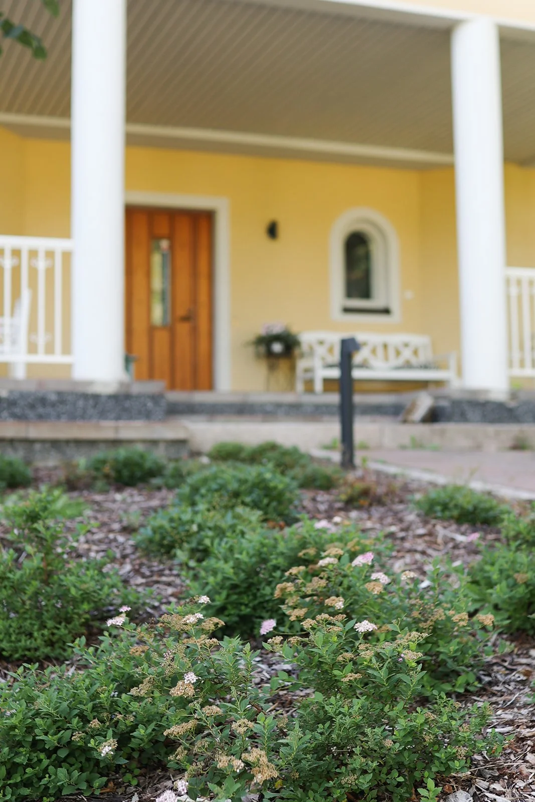 Samalla päivitettiin myös etupihaa, mutta kaikki kunnossa olevat elementit säilytettiin. Kiveyksiin asennettiin reunakivet, istutusalueiden kasvillisuus uusittiin. Koko pihan nurmikko uusittiin siirtonurmikolla rakennustöiden jälkien vuoksi.