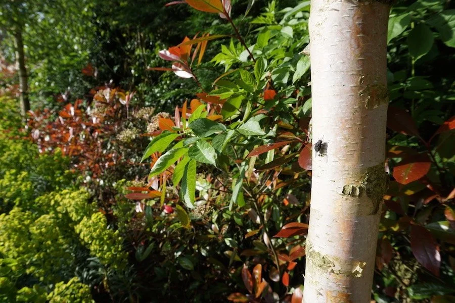 Sekä punamarjasta (Photinia serrulata) ja himalajankoivuista (Betula utilis var. jaquemontii). Koivujen vaaleat rungot erottuvat maisemasta upeasti!